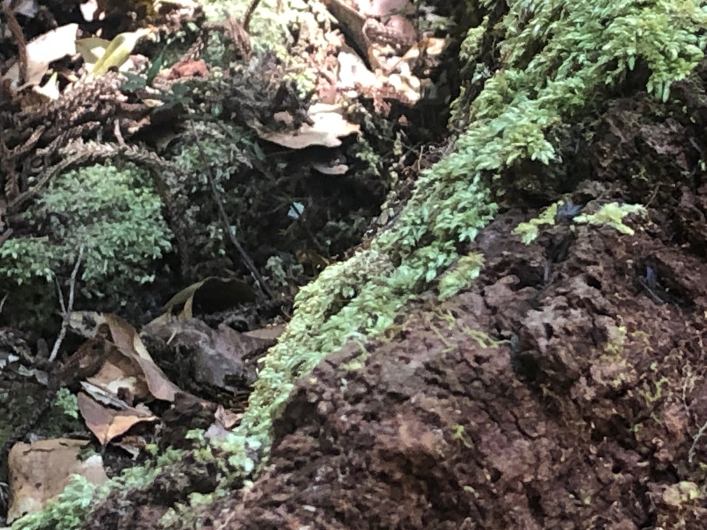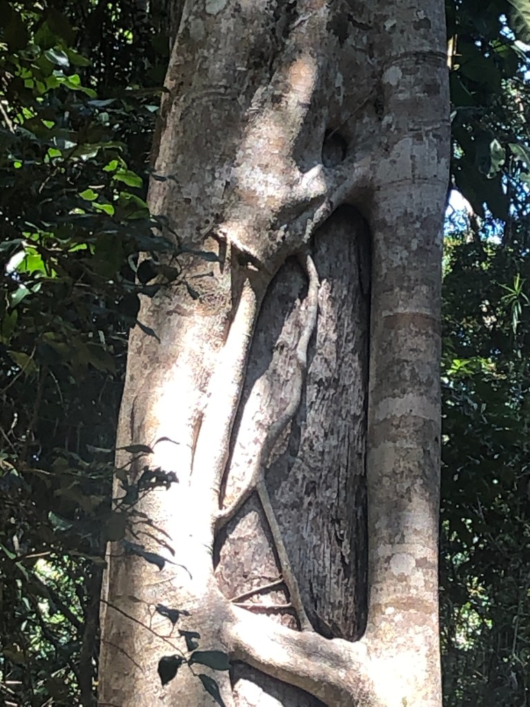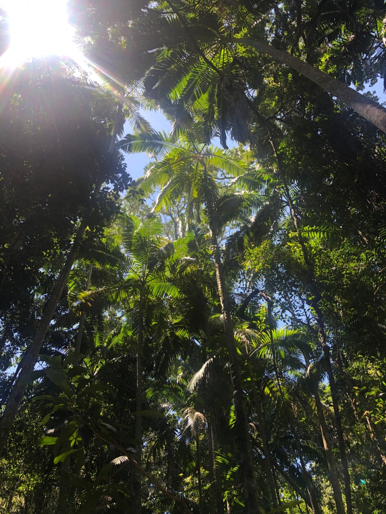 The Palm Grove circuit track in the Noosa National Park is a lovely shady walk with plenty to see. At only 1.1km long and mostly flat you are treated to the understory of the rainforest. There is so much biodiversity down here under the canopy of the tree tops. Mosses, fungi and algae grow on fallen timber and amongst the leaf litter. Look up and you can see crowsnest, staghorn and elkhorn ferns growing high up on the trunks searching for sunlight. And there’s plenty of bird life here in the forest too with brush turkeys scratching around and the call of the cat birds to keep you company along the way.